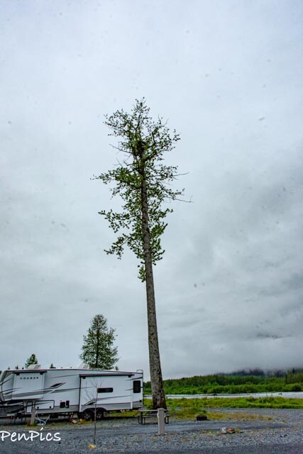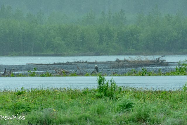 We have a view of the Resurrection River, and as soon as we arrived and were getting camp set up, I looked outside and saw one American Bald Eagle. It was pouring down rain and blowing. The Eagle was still as a statue.