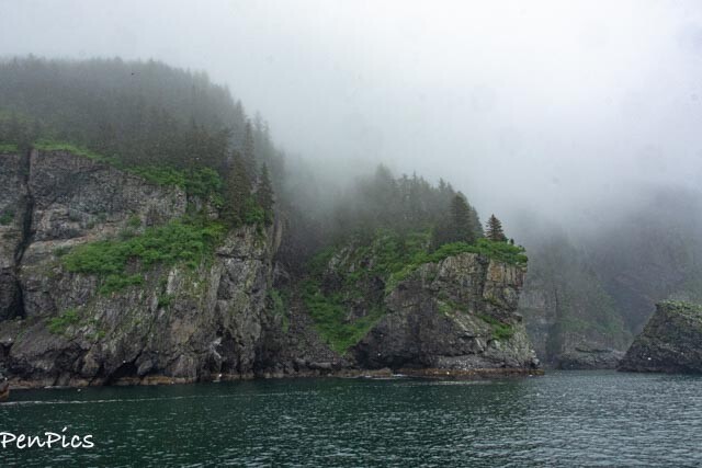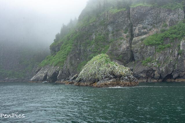 All aboard once again, and we were off for three more hours of boating. It just kept getting better and better, in spite of the low hanging clouds. Fortunately, the fjord is very deep, so we could get right up close to the wildlife and the beautiful rocky formations which had the clouds disappearing for a bit.