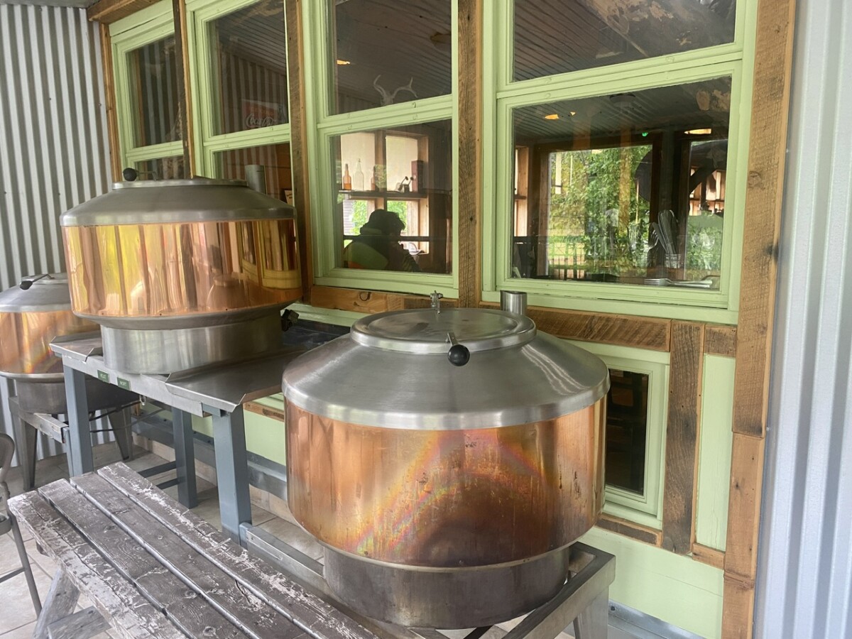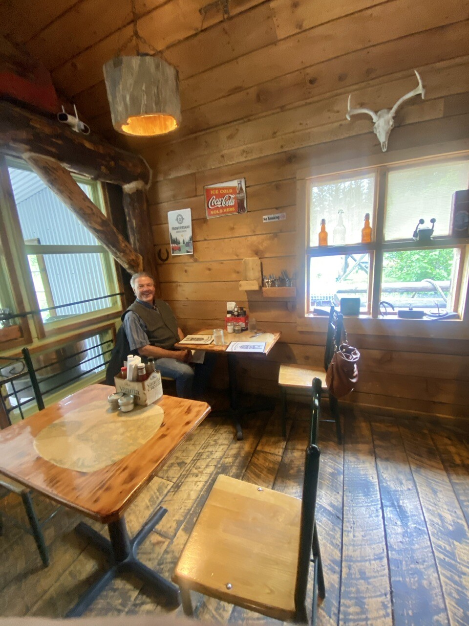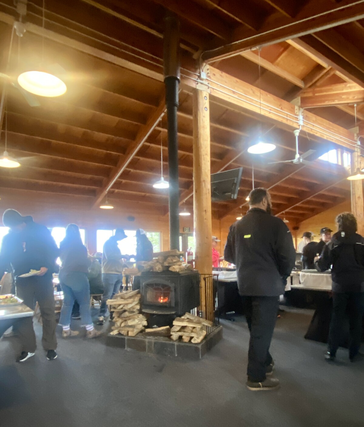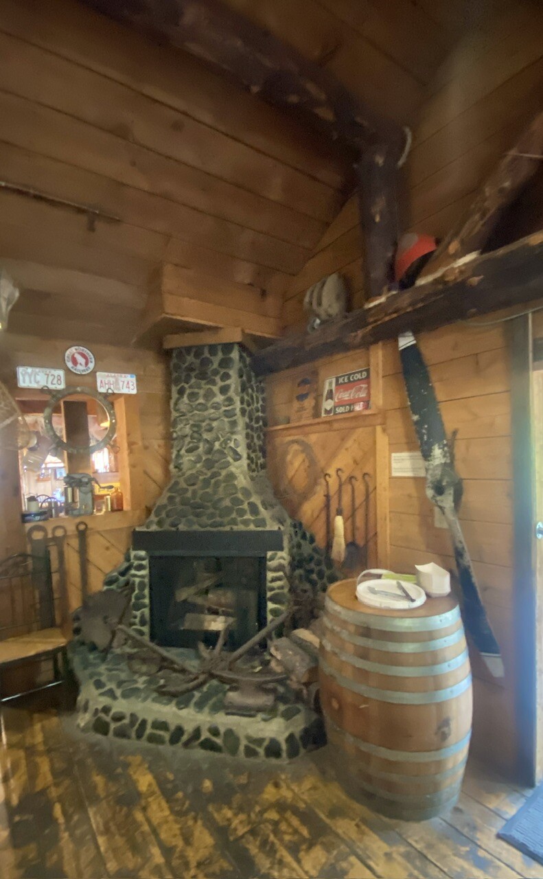 We got a table near a fireplace stove, inside the lodge. The weather is definitely not summer-like, and we had continual rain, and mist.