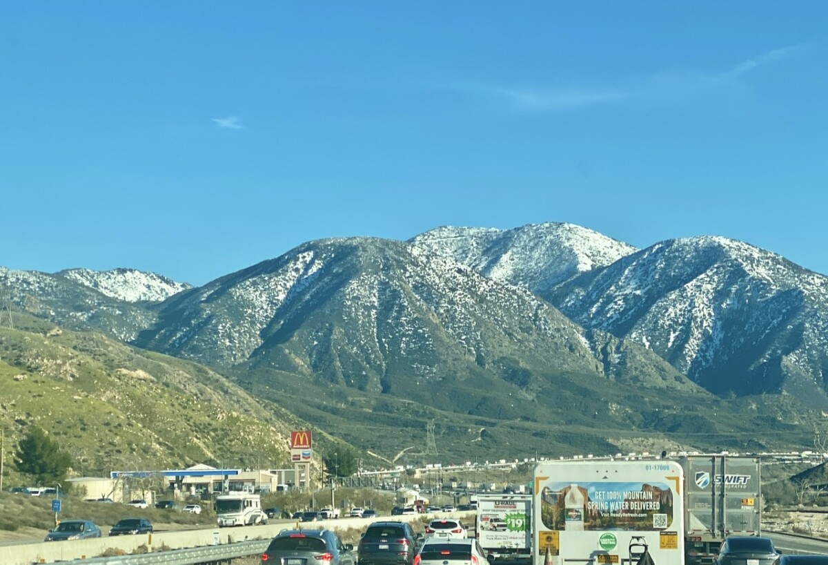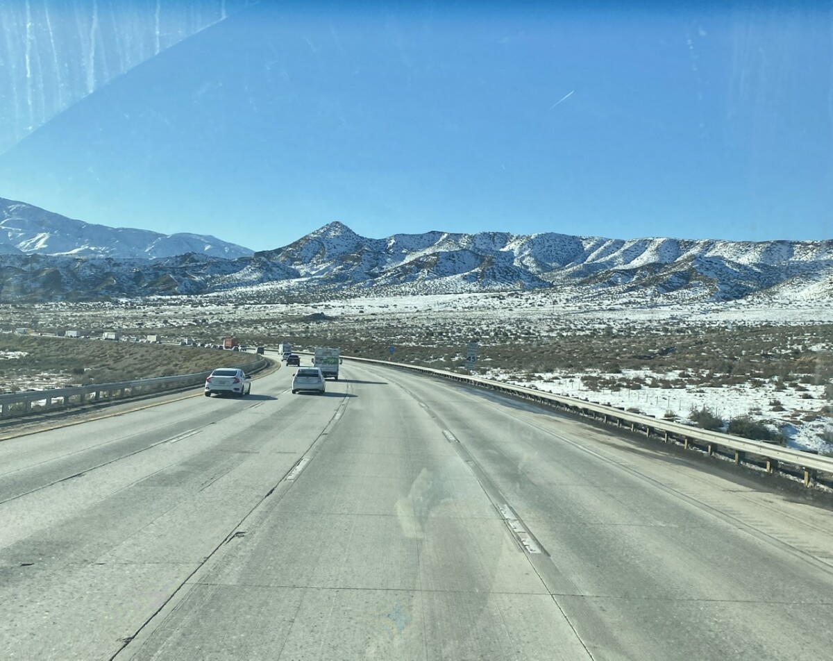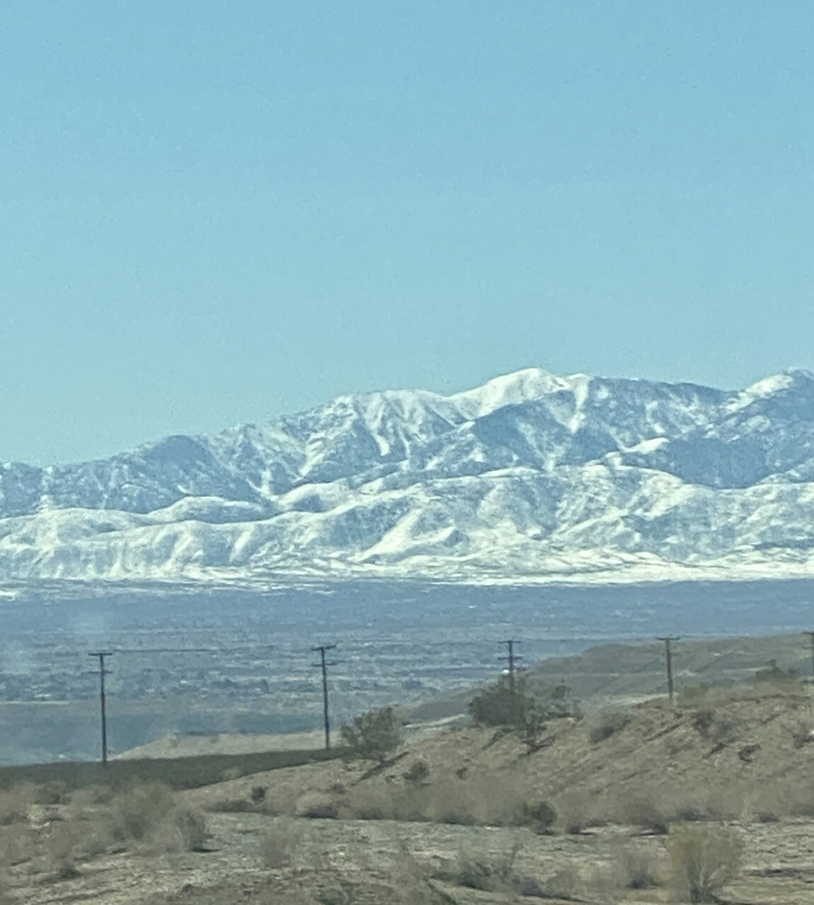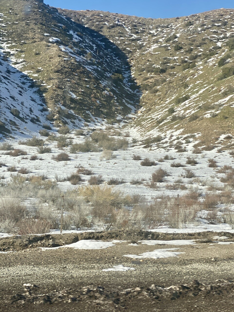 ⬇️ Not great pictures through the windshield I know, but it was really something to witness the snow and green in the winter time as we headed for our house from Barstow.