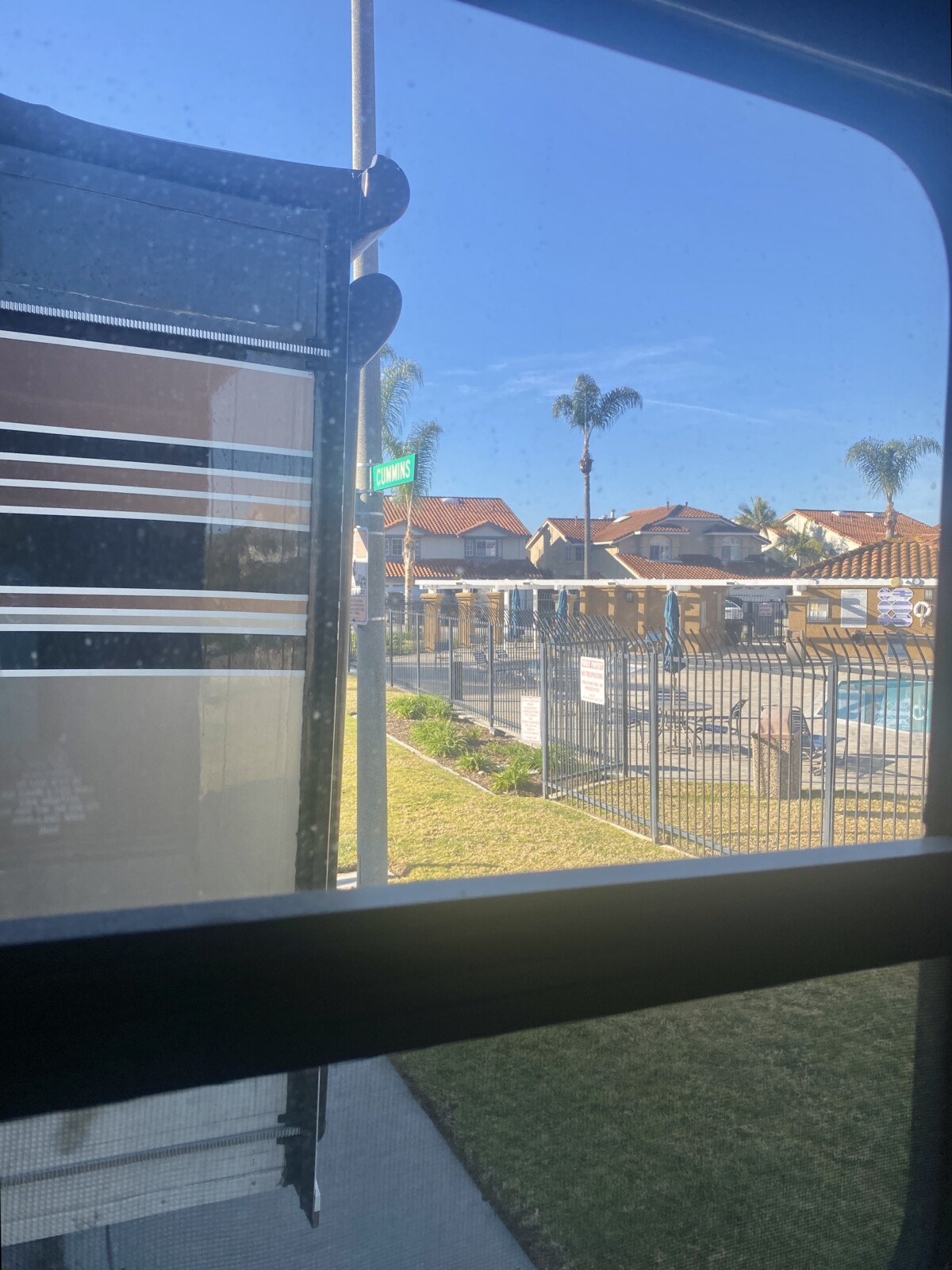 ⬆️ This is a photo from inside The Whale. We parked for one night on the road, across from our house, next to the pool and hot tub. No, our HOA does not allow this kind of RV parking, and we got a visit from the local police, by the next morning.