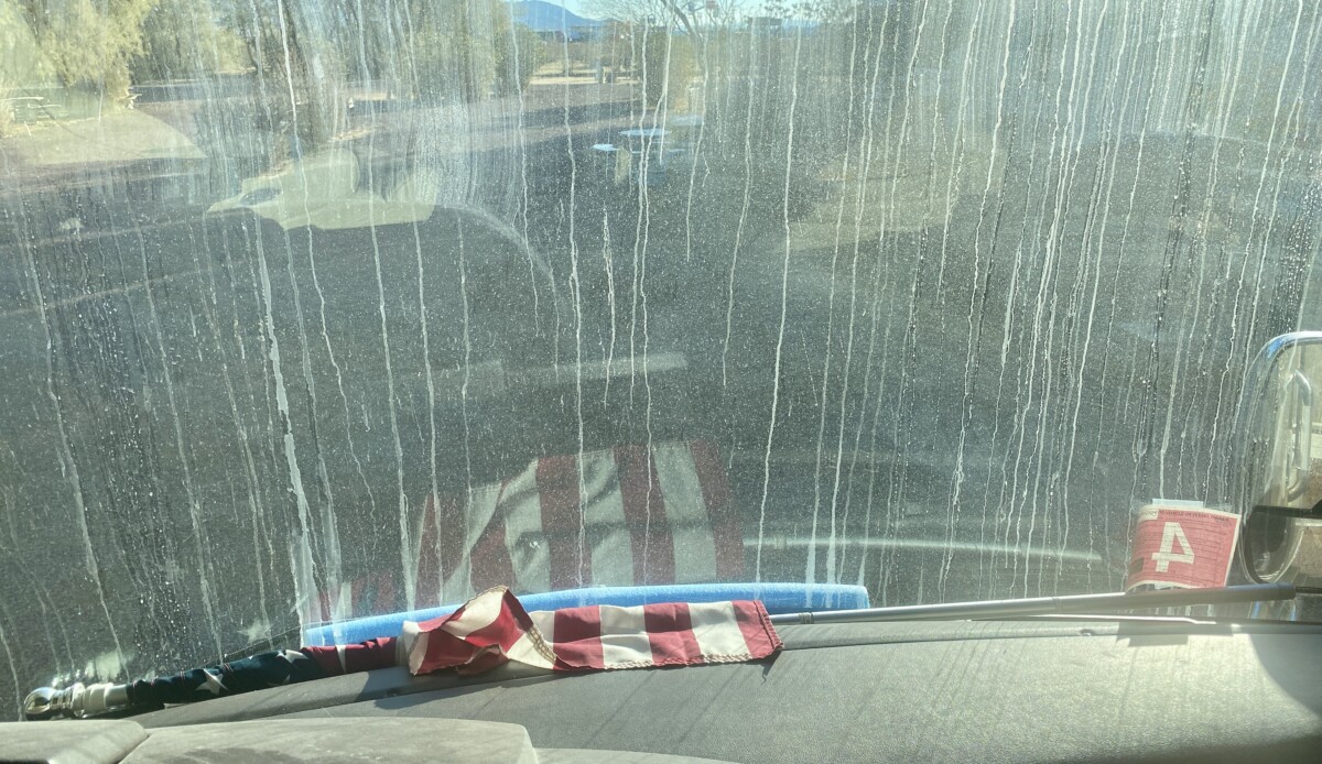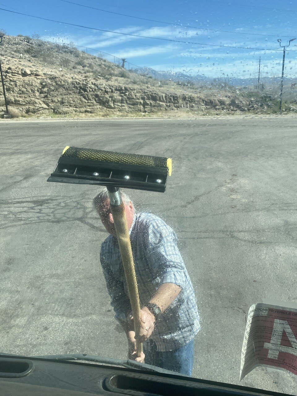 After this major storm, we had never seen The Whale Sooo filthy. We knew there was an RV wash in Kingman, but couldn’t find anyplace before that. The big guy took care of the windshield, though, before we could even drive.