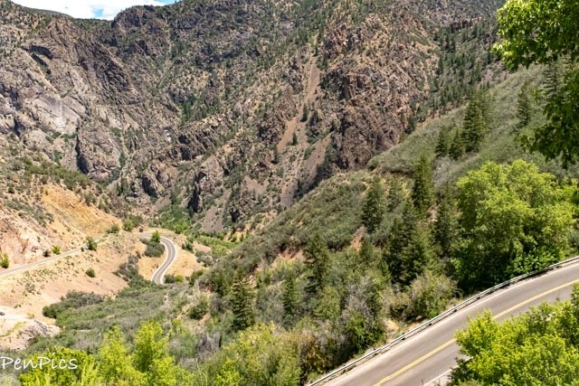 The roadside turnouts reveal Dramatic views of lone trees perched on ragged panicles so removed and inaccessible by anything but a mountain goat or bird. View of the foamy river below can also be had.