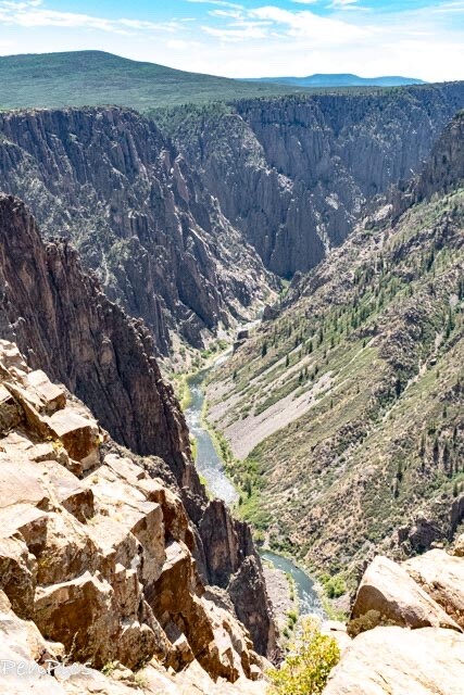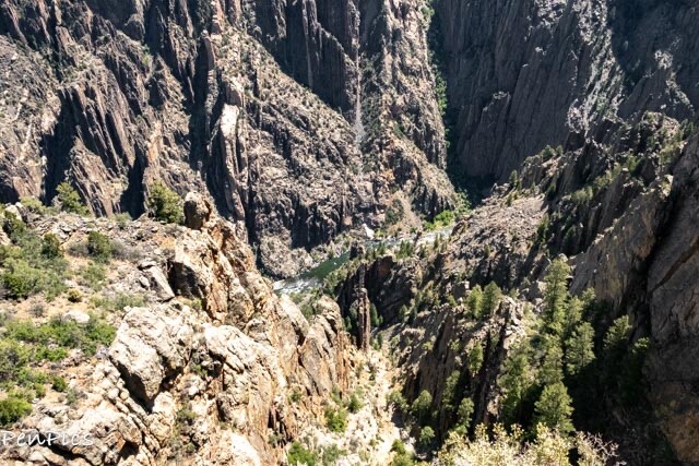 From the heart of Black Canyon of the Gunnison, it’s easy to appreciate the raw power of the Gunnison River. (with drought conditions, it doesn’t roar) Monolithic walls of ebony schist, slashed by veins of granite, and carved to depths of more than 2,000 feet tell the tale of 2 million years of the mighty Gunnison, relentlessly churning through mountains of stone.