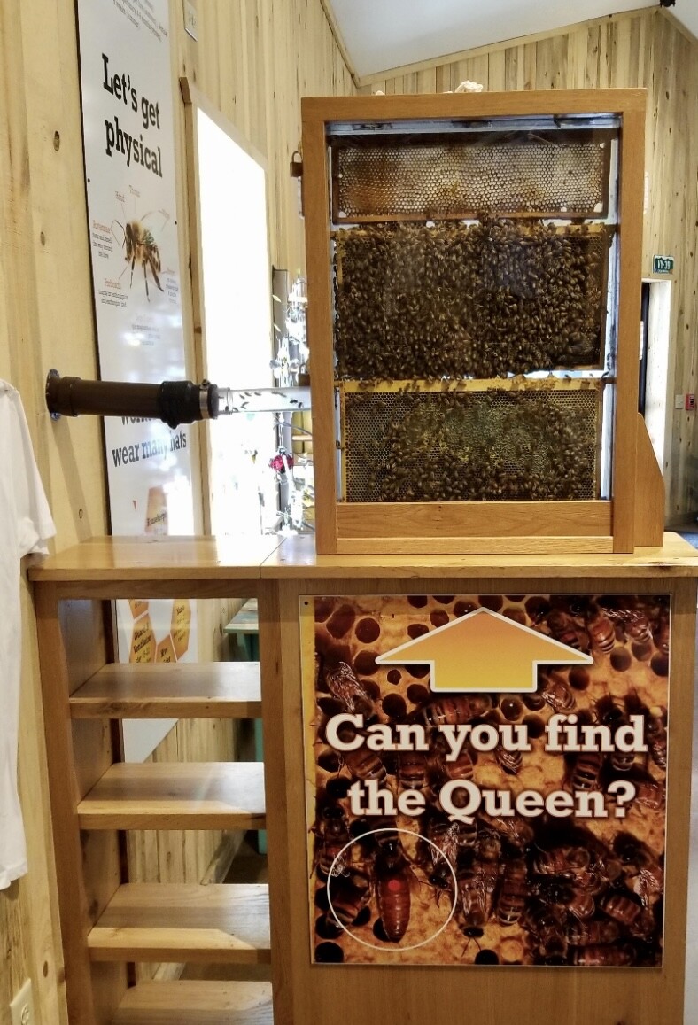The busy bees behind glass inside the store is awesome. There is information about bees, bee colonies, and how they make honey.