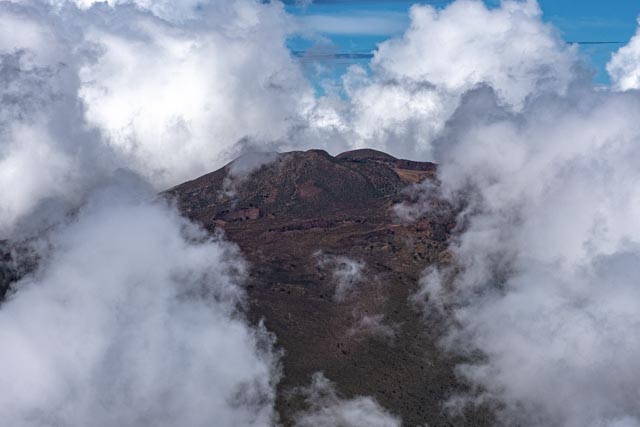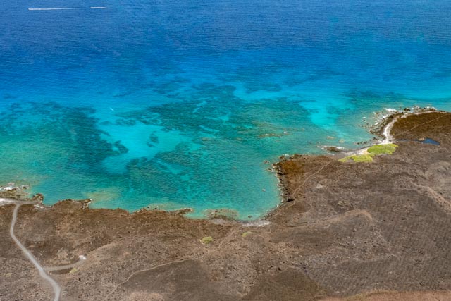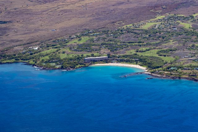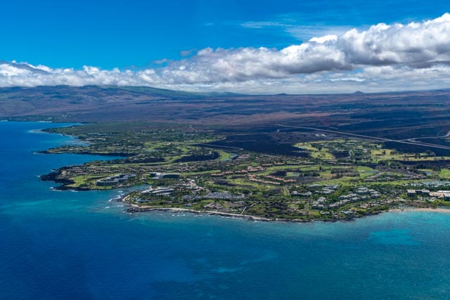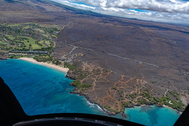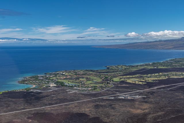 ⬆️ Looking back towards the Pacific Ocean, we could see the island of Maui, floating above a thin layer of clouds, just above the deep blue sea. The coastline is beautiful with coral reefs, with black and white coral sand beaches, dispersed in certain areas. The high-end resorts are huge and so inviting, where they are clustered, near perfect views.