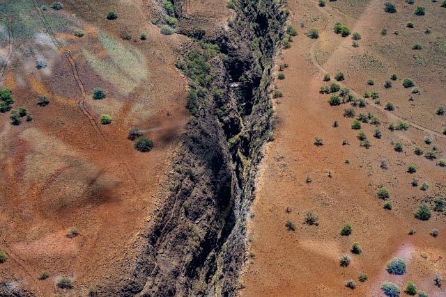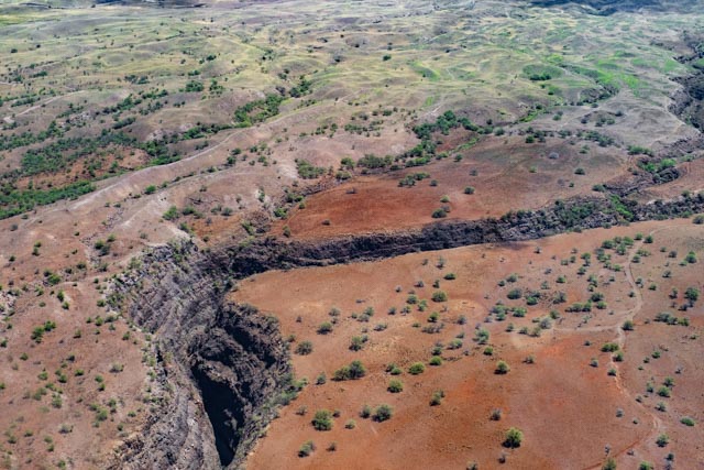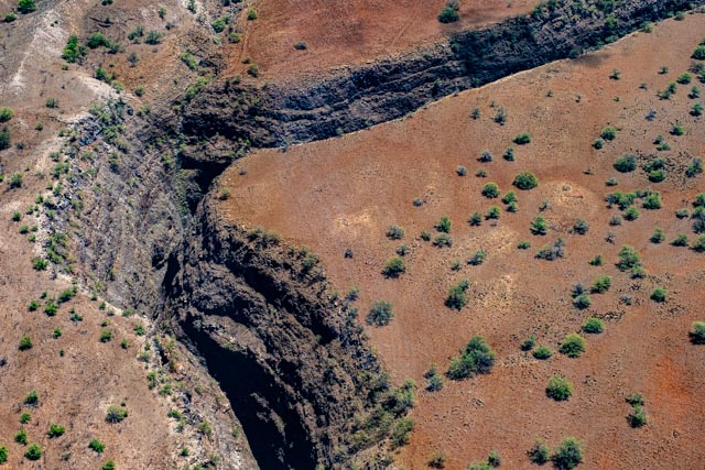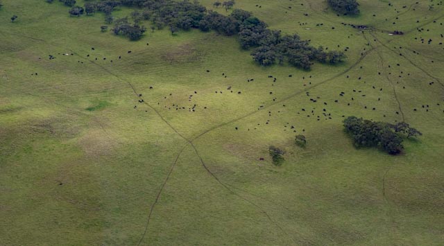 We flew over a deep canyon inset, cut deep from former water flowing hard and fast through them, a long time ago. Huge ranches with thousands of Black Angus Cattle fill green pastures, on the way to the waterfalls.