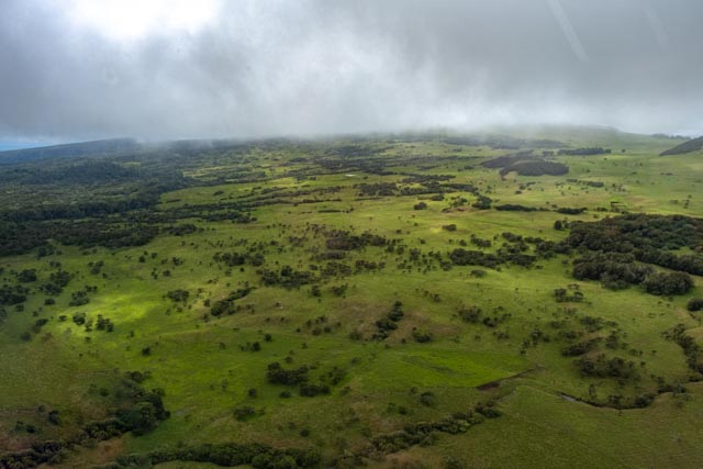 To start, we flew up to several vents and small craters, showing past volcanic activity. The first fly-over area definitely has a lot of rain, as the mountain sides are a rich green. Inside the crater, they are the color of the lava; black, light brown or a rust color. We followed the lava flow, which we liken to a river flow of the once hot lava of up to 2000 degrees! More small vents follow a line down the same lava flow. Some look like a mountain pimple, others resemble scars. The largest craters of Kilauea were covered with clouds, and rain, so unfortunately we could not see them, but nobody controls Mother Nature.
