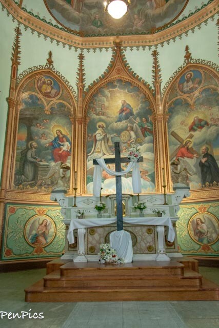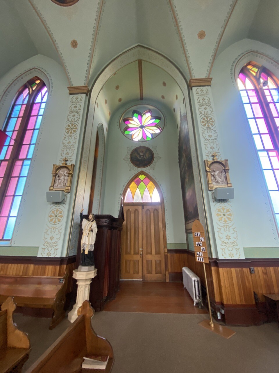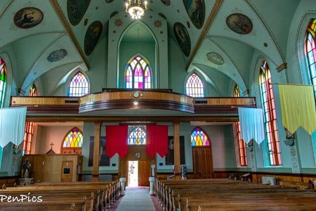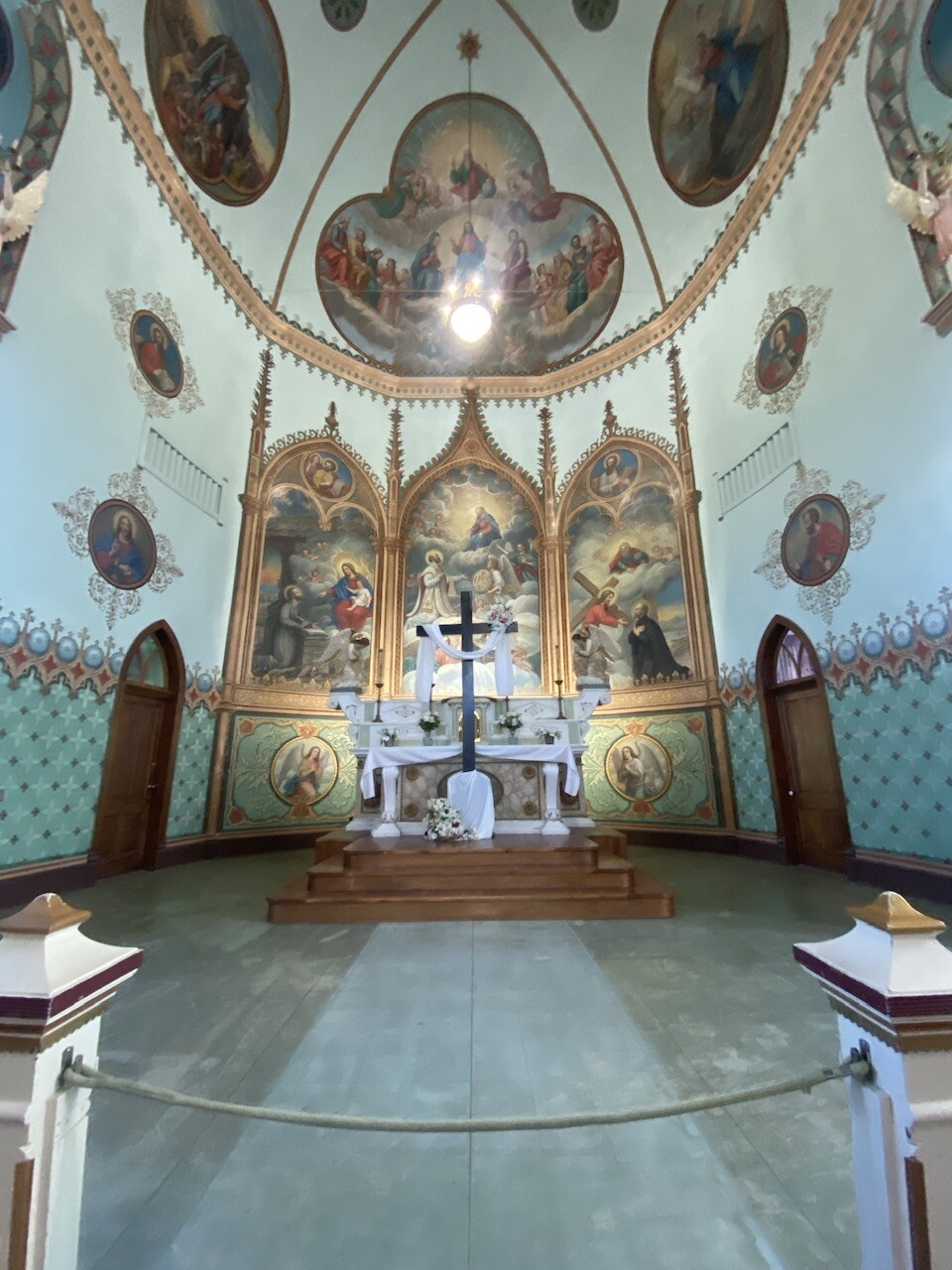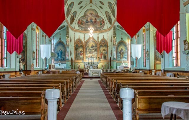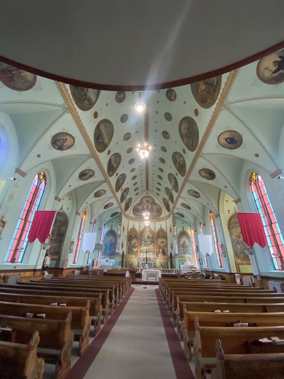 This Catholic Church is unique because its walls and ceilings have 58 original paintings by Brother Joseph Carignano on them. (Carignana served in the resident kitchen and had no training in arts)