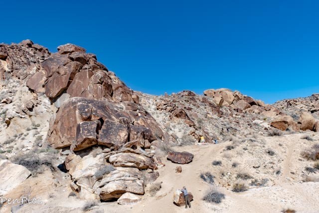 The petroglyphs are a short distance (about 1/4 mile) from the parking lot and trailhead. We chose to walk through the wash to arrive at the canyon entrance, but you can also follow a trail along the ridge.