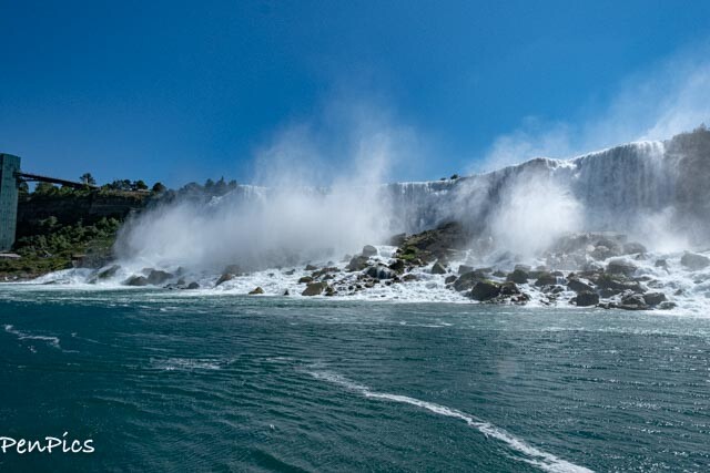 ⬆️ From there, the boat ferries past the base of the American Falls, and onto the basin of Horseshoe Falls; the dramatic passage leading you through the roiling waterfall whitewater and massive rock formations.