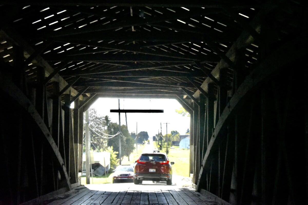 On our Amish tour we crossed a covered bridge, just following an Amish horse and buggy carriage was crossing. The tour ended at a hotel/restaurant that was made from train cabooses. The steam train was passing by and the steam engine detached from the cars full of people. Luckily the land was level so the detached cars did not roll away. It was quite the scene as the engine had to back up, that caused the engine to be reduced of steam pressure for several minutes. After the reduction the engine could be reversed and recoupled . Soon the whole train took off with happy tourist.