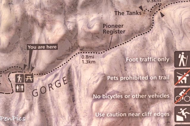 This trail is 0.8 miles round trip, if you turn around after the Pioneer Register, or 2 miles round trip if you continue to the natural water tanks.