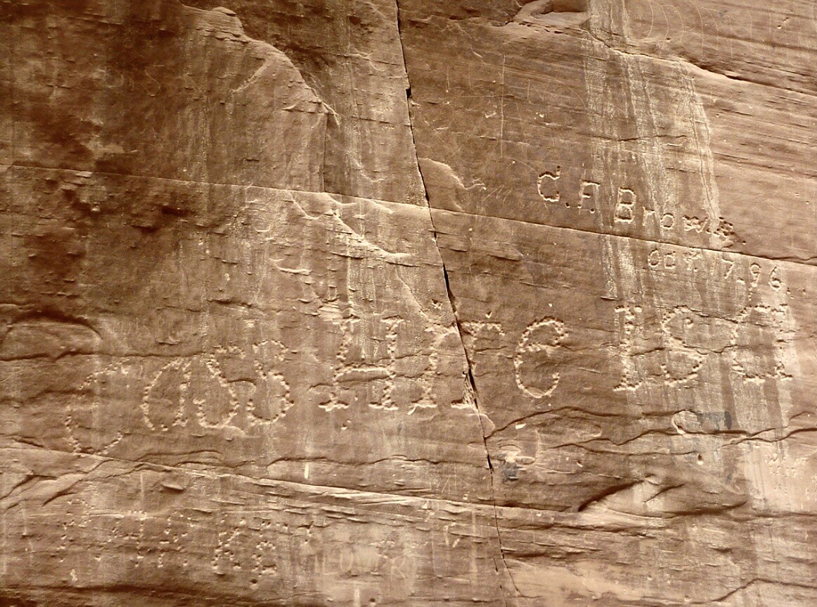 look at the north side of the canyon wall (left). There, you will the many names, dates; carved, painted, and in one case, shot, into the sandstone. Prospectors, explorers, surveyors, cowboys, area settlers, and early visitors would often stand on their wagons to carve their names into the canyon wall. They were leaving their mark above flash flood danger, likely hoping their names would survive for centuries.