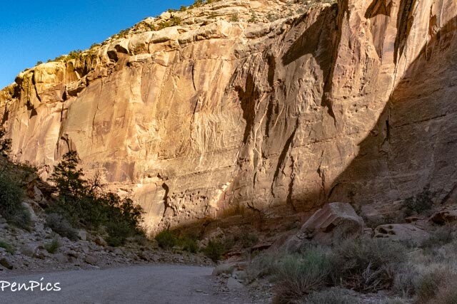 Capitol Gorge Road is at the end of the Scenic Drive where the road begins to the left at a parking area with restrooms. Continue down the dirt road for 2.4 miles to reach the end of the road.